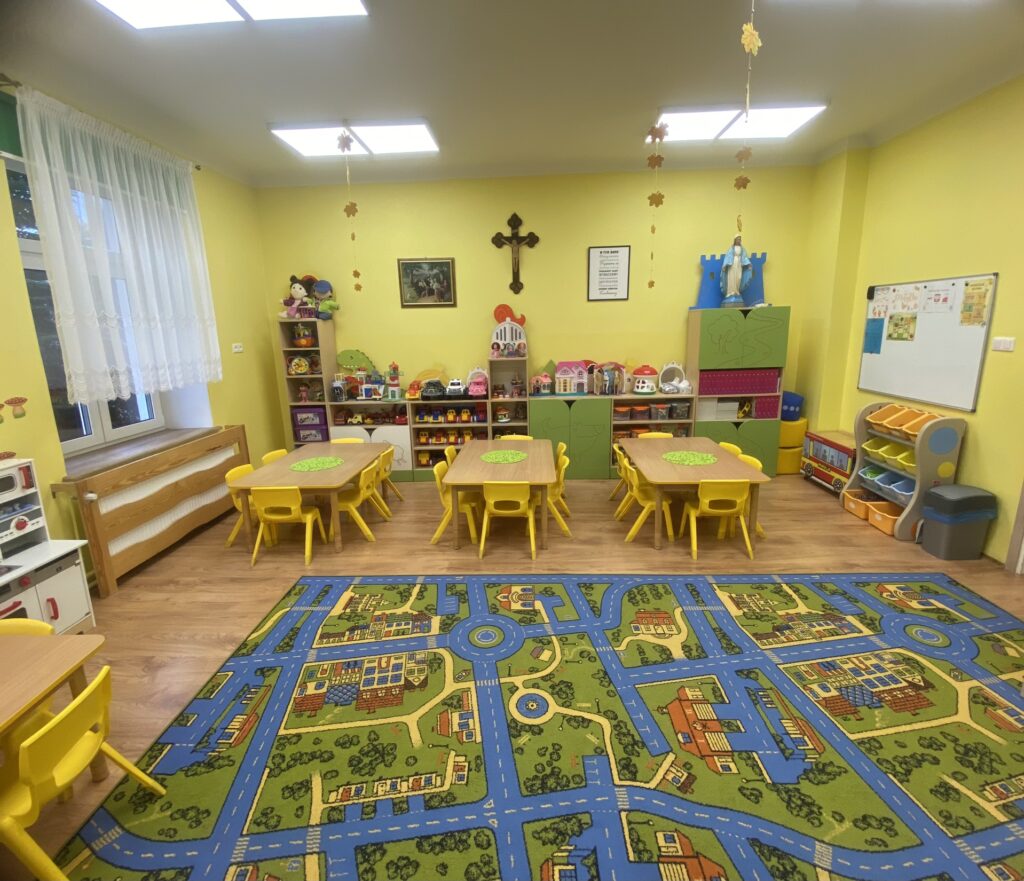 Współcześnie przedszkole znajduje się w budynku stanowiącym własność Zgromadzenia Sióstr Służebniczek NP NMP ul. Wojska Polskiego 9, w Aleksandrowie Kujawskim. Przedszkole prowadzą Siostry Służebniczki. Główna siedziba zgromadzenia znajduje się w Konstancinie. Obecnie budynek składa się z dwóch kondygnacji i strychu. Parter zaadoptowany jest na przedszkole, posiada sale przedszkolne, gabinet logopedyczny, kuchnie z zapleczem kuchennym oraz szatnie i sanitariaty. Piętro stanowi dom mieszkalny Sióstr Służebniczek. Na drugiej kondygnacji znajduje się odnowiona kaplica, z której również korzystają dzieci oraz pracownicy świeccy przedszkola. Strych służy jako magazyn do wszelkich materiałów przedszkolnych. Na teranie instytucji znajduje się dobrze wyposażony plac zabaw zgodny z normami unijnymi.